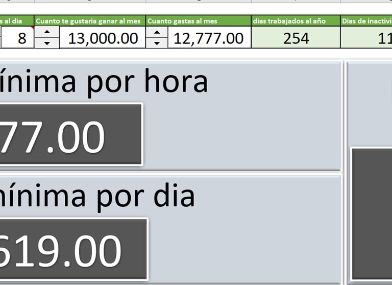 Propósito: Calcular tu tarifa mínima por hora basada en tus ingresos deseados y tus días de trabajo. Instrucciones:
